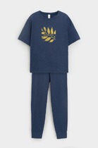 Легкий комплект для комфортного сна и отдыха из меланжевого трикотажа. Футболка с принтом и спущенной линией плеча комфортно садится по фигуре.  Брюки с эластичными манжетами с боковыми карманами. Круглый шнур позволяет регулировать посадку. Гладкий материал приятен к телу и позволяет коже дышать.