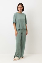 Комплект из объемного трикотажа с добавлением эластичных волокон. Свободный силуэт, мягкий пояс и отсутствие боковых швов на брюках обеспечат комфорт во время сна и отдыха.