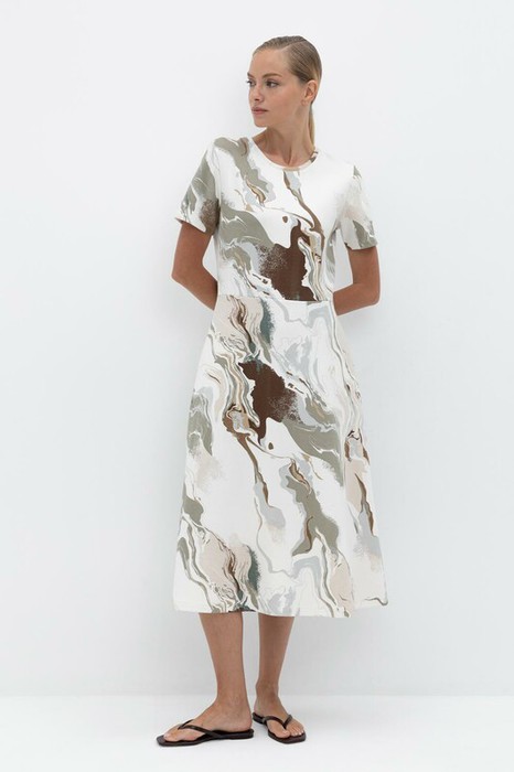 Платье с круглым вырезом и короткими рукавами из плотного набивного трикотажа интерлок. Модель с трапециевидной юбкой и боковыми карманами.