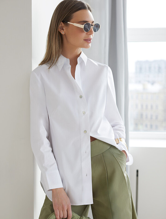 Блузка выполнена из премиального хлопкового поплина. Лаконичная модель с высокими манжетами и пуговицами из натурального перламутра хорошо впишется в любой гардероб и внесет яркий летний акцент в образ. Натуральный состав ткани обладает высокой воздухопроницаемостью и гигроскопичностью. В изделии будет комфортно, даже в самое жаркое время года. Подходит для любой фигуры. На спинке фирменный логотип бренда.