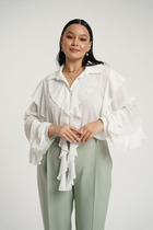 Летящая блузка с отложным воротником выполнена из премиальной вискозы и лиоцелла. Мягкий фактурный материал струится по телу. Вискоза обеспечивает отличную воздухопроницаемость и поддерживает комфортный микроклимат. Модель дополнена пуговицами из натурального перламутра, на спинке изделия металлический логотип бренда. Отлично впишется в нестрогий офисный дресс-код или в расслабленном повседневном образе с джинсами и юбками.