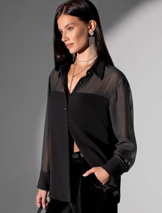 Элегантная блузка черного цвета создана для женщин, которые ценят стиль и комфорт каждый день. Полупрозрачный шифон в верхней части блузки придает образу легкость и утонченность, подчеркивая индивидуальность в любой ситуации. Такая нарядная блузка моментально преобразит повседневный лук, делая его более выразительным и женственным. Плотная ткань блузки красиво струится по фигуре, подчеркивая женственность. Оригинальный крой и продуманная отделка позволяют сочетать блузку с брюками, юбками или джинсами — вы всегда будете выглядеть свежо и современно. Текстура ткани обеспечивает максимальное удобство, а полупрозрачная структура добавляет загадочности без излишней откровенности. Стильная модель подходит как для деловых встреч, так и для прогулок по городу или вечерних мероприятий. Благодаря универсальности фасона легко создаются новые комбинации в зависимости от настроения и случая.