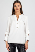 Блузка прямого силуэта с контрастными манжетами и отложным воротником. Модель выполнена из хлопка с добавлением ПЭ, благодаря этому материал почти не мнется, долго сохраняет идеальный внешний вид. На спинке изделия металлический логотип бренда.