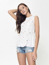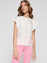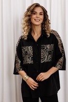 Свободный крой блузки и спущенная линия плеча дарят ощущение легкости и непринужденности, делая образ одновременно женственным и современным. Широкие рукава средней длины гармонично дополняют образ и идеально подходят для полных рук, обеспечивая комфорт, свободу движений и уверенность. Аккуратная застежка на маленькую пуговицу добавляет утонченности, а круглый вырез красиво обрамляет шею, создавая аккуратную линию декольте.