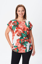 Свободный крой блузки и спущенная линия плеча дарят ощущение легкости и непринужденности, делая образ одновременно женственным и современным. Широкие рукава средней длины гармонично дополняют образ и идеально подходят для полных рук, обеспечивая комфорт, свободу движений и уверенность. Аккуратная застежка на маленькую пуговицу добавляет утонченности, а круглый вырез красиво обрамляет шею, создавая аккуратную линию декольте.