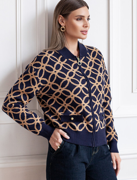 Бомбер жаккардовой вязки выполнен из нежной пряжи на основе вискозы с добавлением кашемира. Мягкая модель с золотистой фурнитурой не раздражает кожу, приятно ощущается на теле и поддерживает комфортный микроклимат. Совет стилиста: трендовая модель эффектно впишется в сдержанный образ, добавив образу выразительности. Сочетайте с однотонными брюками, юбкой, платьем или джинсами