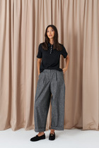 Брюки-палаццо выполнены из фактурной черно-серой поливискозы. .  Модель дополнена боковыми карманами и отлично подойдет как для строгого делового образа с блузкой и жакетом, так и для более расслабленного  с футболкой и водолазкой. Эластичный материал изделия поддерживает оптимальный микроклимат, формоустойчивость  и комфорт в течение всего дня.