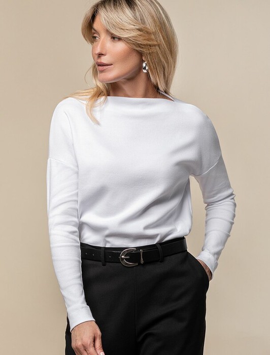 Джемпер со спущенной линией плеча выполнен из фактурного трикотажа в рубчик. Модель идеально сидит по фигуре не сковывая движения. Хлопковый трикотаж поддерживает оптимальную температуру тела, поэтому в изделии будет комфортно в течении всего дня. Наличие эластана в составе гарантирует формоустойчивости. Базовая модель впишется в любой гардероб.