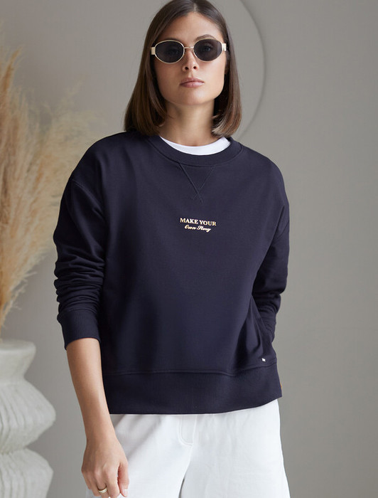 Перевод принта: Make your own story - стань автором своей истории. Джемпер среднего объема со спущенным плечом выполнен из футера двухнитки с эластаном. Принт нанесен фактурной золотой краской. Эластичный материал гарантирует комфорт и формоустойчивость. Сочетается в костюме с брюками D44.138, D44.139 и шортами D48.008. Изделие дополнено металлическим логотипом бренда.