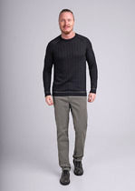 Черный джемпер с воротом, застегивающимся на черепаховые пуговицы, связали из мягкого хлопка с добавлением акрила; состав, который отлично согревает, не колется и при этом не перегревает тело, поэтому вещь получилась максимально комфортной для переменчивой погоды. Повседневный образ поддержат светлые брюки, синие джинсы и броги.