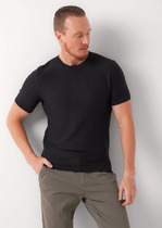 Черный джемпер с воротом, застегивающимся на черепаховые пуговицы, связали из мягкого хлопка с добавлением акрила; состав, который отлично согревает, не колется и при этом не перегревает тело, поэтому вещь получилась максимально комфортной для переменчивой погоды. Повседневный образ поддержат светлые брюки, синие джинсы и броги.