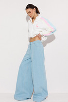 Джинсы mom-fit в голубом оттенке выполнены из эластичного денима. Модель с эффектной стиркой и  декоративными рваными элементами, с бахромой по низу изделия. Изделие подходит для любой фигуры. На спинке фирменный брендированный патч.