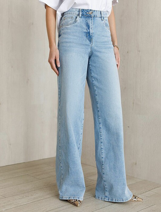 Джинсы трубы светло-голубого цвета выполнены из эластичного денима плотностью 13,7 OZ - классическая структура, которая отлично держит форму.и подчеркивает фигуру. После пошива изделие подвергли специальному виду вошинга — salt-stone washing (солт-стоун вошинг), что дословно значит стирка с каменной солью. Такой вид вошинга позволяет получить стильные потертости на голубых оттенках денима. Джинсы прямого кроя визуально вытягивают силуэт, благодаря эластану в составе аккуратно садятся на любую фигуру и обеспечивают максимальный комфорт в течение дня, не сковывая движения. Широкая размерная линейка подходит для разных типов фигур: свободные джинсы комфортны как для обладательниц пышных форм, так и для худеньких. Плотные джинсы идеально держат форму даже при активном движении и не вытягиваются после долгой носки. Качественная фурнитура и нашивка из эко-кожи с логотипом бренда делают эти джинсы премиальными. Широкий крой добавляет актуальности — такие джинсы отлично сочетаются как с обувью на каблуке, так и на пл