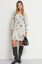 Платье длины мини с воротником поло выполнено из мягкого трикотажа на основе шелковистой эластичной вискозы. Жаккардовое переплетение образует геометрический узор. Застежка на перламутровые пуговицы подчеркивает гладкость пряжи. Контрастный воротник и манжеты делают узор еще более выразительным. Можно сочетать с жакетом D31.388 из жаккардовой коллекции.
