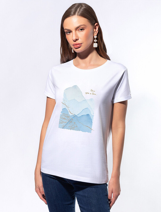 Совместные покупки Тюмень Женская одежда Футболки — Vilatte Футболка из эластичного хлопка с принтом стразы D49.097 белый_акварель