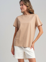 Футболка с цельнокроеным рукавом выполнена из премиального хлопка. Базовая однотонная модель идеально впишется в любой гардероб. V-вырез подчеркивает ключицы и удлиняет шею, хорошо сочетается с жакетами или кардиганами. Изделие дополнено металлическим логотипом бренда.