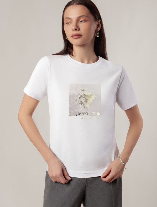 Совместные покупки Тюмень Женская одежда Футболки — Vilatte Футболка из премиального хлопка с авторским принтом D49.110 белый_own st