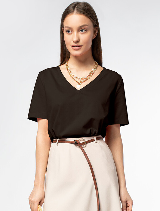 Базовая однотонная футболка из премиального хлопка с треугольным вырезом.  Добавление ПУ в состав изделия способствует эластичности и формоустойчивости. Самое высокое качество хлопковых волокон обеспечивает комфорт даже в жаркое время года. Идеально держит форму и сохраняет внешний вид в течение долговременного использования. Удобная форма для любого гардероба.