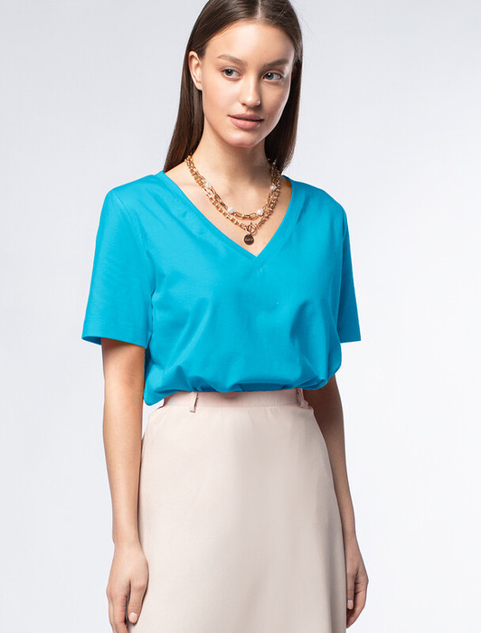 Базовая однотонная футболка из премиального хлопка с треугольным вырезом.  Добавление ПУ в состав изделия способствует эластичности и формоустойчивости. Самое высокое качество хлопковых волокон обеспечивает комфорт даже в жаркое время года. Идеально держит форму и сохраняет внешний вид в течение долговременного использования. Удобная форма для любого гардероба.