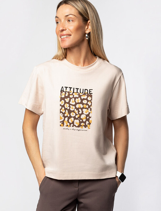 Совместные покупки Тюмень Женская одежда Футболки — Vilatte Футболка из премиального хлопка с принтом фольгой D49.098 бежевый_attitu