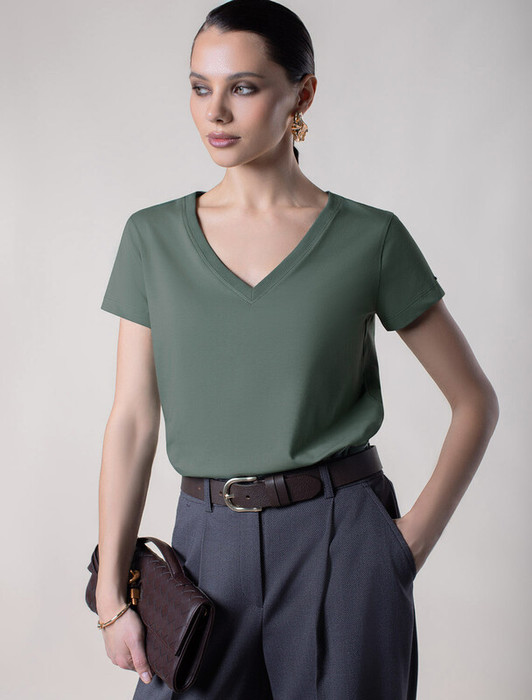 Однотонная футболка с V-образным вырезом выполнена из премиального хлопка. Добавление эластана в состав изделия способствует формоустойчивости. Самое высокое качество длинноволокнистых хлопковых волокон обеспечивает комфорт в любое время года.Универсальная базовая будет уместна не только в повседневном образе с денимом, но и в офисе с нестрогим дресс-кодом, в паре с брюками и жакетом.