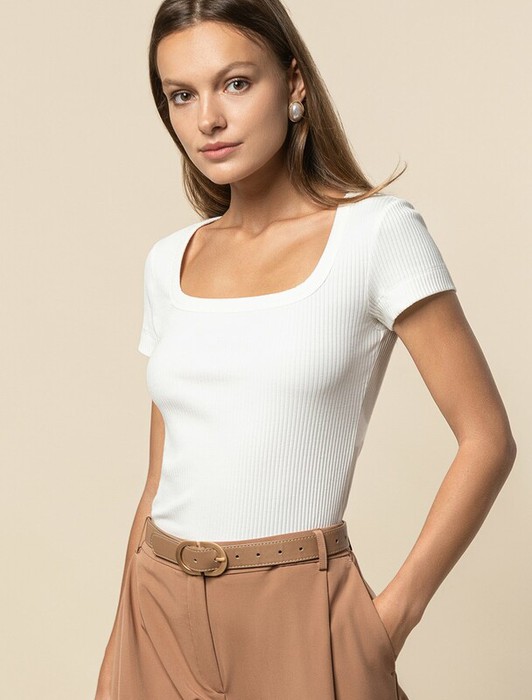 Футболка выполнена из трикотажа в широкий рубчик. Приятная к телу хлопковая ткань с гладкой трикотажной фактурой. Вырез каре подчеркивает изящество фигуры с акцентом на декольте и поддерживает силуэт. Лучшее решение для комплектов с акцентом на талию с объемными низами – палаццо, кюлотами или пышными юбками. Изделие украшено фирменным логотипом бренда.
