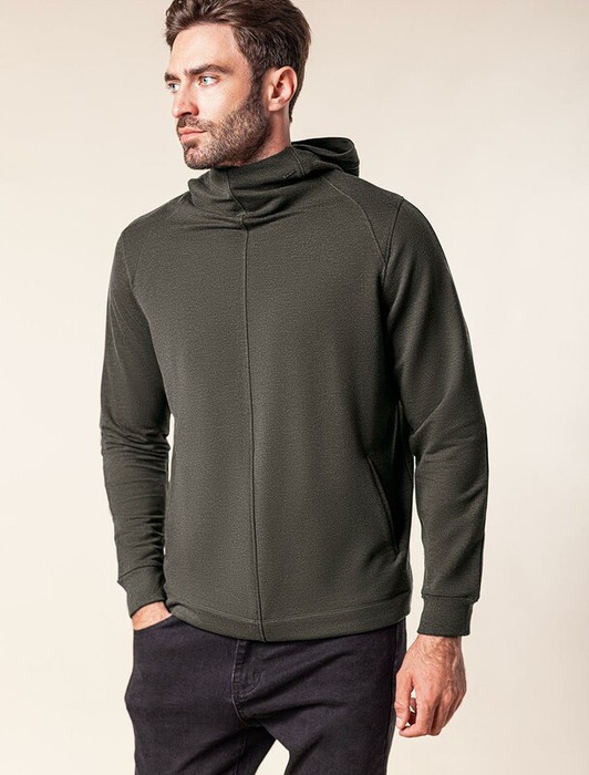 Лаконичное худи выполнено из эластичного футера. Мягкий и плотный материал хорошо пропускает воздух, а наличие ПЭ в составе способствует формоустойчивости и легкости изделия. Модель дополнена логотипом бренда. Сочетается в костюме с брюками U44.008
