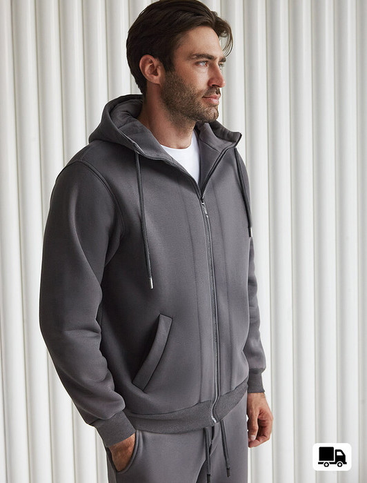 Худи на молнии выполнено из премиального эластичного футера трехнитки с теплым начесом. Модель с капюшоном и воротом стойка дополнена боковыми карманами и нашивкой с логотипом бренда из эко-кожи. Ранней осенью или поздней весной можно носить в качестве верхней одежды. Высококачественная фурнитура цвета темное серебро. Изделие сочетается в костюме с брюками U44.006