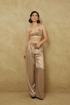 Кюлоты с разрезами выполнены из тонкого лиоцелла. Модель дополнена двумя карманами по бокам и эластичным поясом на резинке. Приятная на ощупь тонкая ткань охлаждает кожу и успокаивающе действует на нее, а крой не ограничивает свободу движений. Графичный  принт поддерживает легкий блеск ткани.
