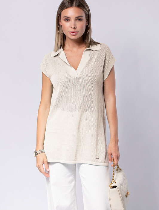 Летнее полупрозрачное поло тончайшей вязки выполнено из мягкой пряжи на основе хлопка и вискозы. Идеально подойдет в жару, с мини-топом или в сочетании с купальником. Также отлично впишется в многослойные образы с джинсами и жакетом. Модель дополнена металлическим логотипом бренда.