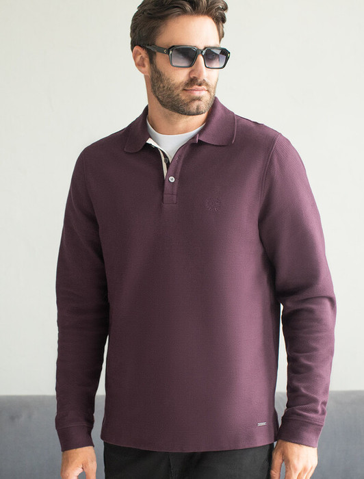 Стильный лонгслив цвета бургунди с плетеным воротником поло с застежкой на металлические пуговицы выполнен из премиального хлопка в сочетании с эластаном . Невероятно мягкая ткань из натуральных волокон - она едва ощутима на коже и словно обнимает тело. Материал при касании кажется бархатистым, при движении он словно повторяет все мельчайшие линии фигуры. По свойствам материал сочетает в себе практичность и нежность:  отлично провускает воздух, сохраняя ощущение свежести в течение всего дня, при этом созраняет тепло в прохладную погоду.Идеально подходит для чувствительной кожи, не вызывает раздражения и дискомфорта. Удобный отложной воротник с контрастной отделкой делает образ современным и стильным, а длинные рукава с манжетами защищают руки при ветреной погоде.
