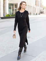 Платье прямого силуэта фактурной вязки выполнено из хлопка с добавлением кашемира.