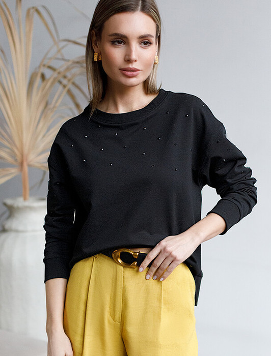 Совместные покупки Тюмень Женская одежда Джемперы, свитеры, водолазки — Vilatte Свитшот из эластичного футера с принтом стразами D49.072 черный_стразы