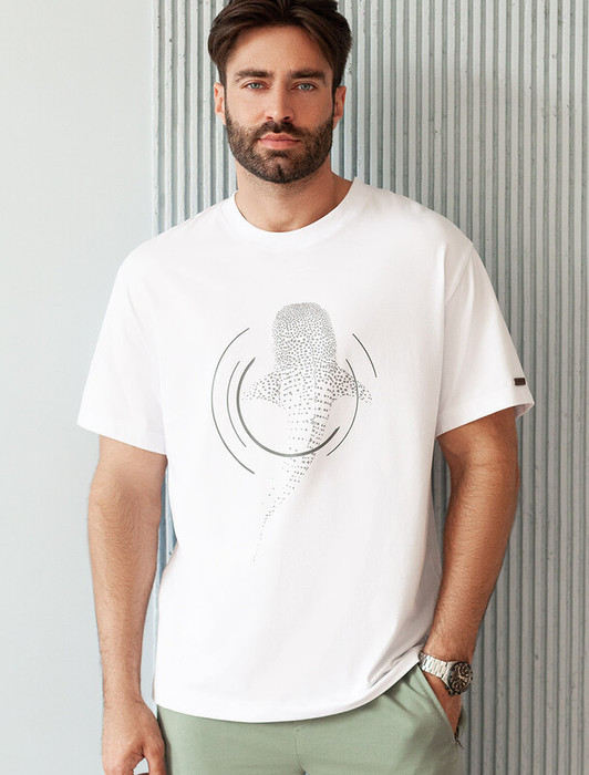 Совместные покупки Тюмень Мужская одежда Футболки — Vilatte Свободная футболка с авторским принтом U49.048 белый_китовая акула
