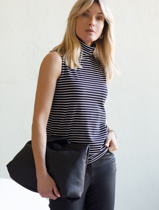Топ с воротом как у водолазки выполнен из премиального хлопка. Наличие эластана в составе изделия способствует формоустойчивости. Модель хорошо будет сочетаться в комплекте с жакетом или кардиганом, так как отсутствие рукавов позволит комфортное использование в многослойных образах. Из украшений металлический логотип бренда.