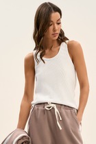 Топ выполнен из трикотажа в широкий рубчик. Эластичный хлопковый трикотаж сидит по фигуре, не сковывает движений и очень комфортный в носке. Фактура вертикальных полос визуально стройнит и вытягивает силуэт. Базовое изделие хорошо впишется в любой гардероб. Идеально подходит для многослойных образов.