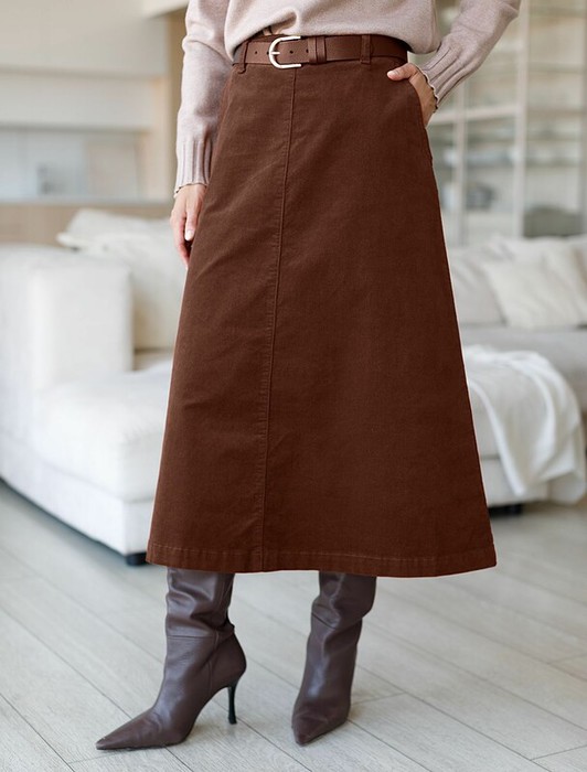 Юбка-миди трапециевидного силуэта  выполнена из мягкого хлопкового микро-вельвета с добавлением эластана. Изделие комфортно садится по фигуре и не сковывает движения. Модель дополнена высококачественной фурнитурой с фирменным логотипом бренда. Хорошо комбинируется с вязаным трикотажем, блузками и денимом.Также прекрасно станет альтернативой деловым низам  в нестрогом офисном дресс-коде.
