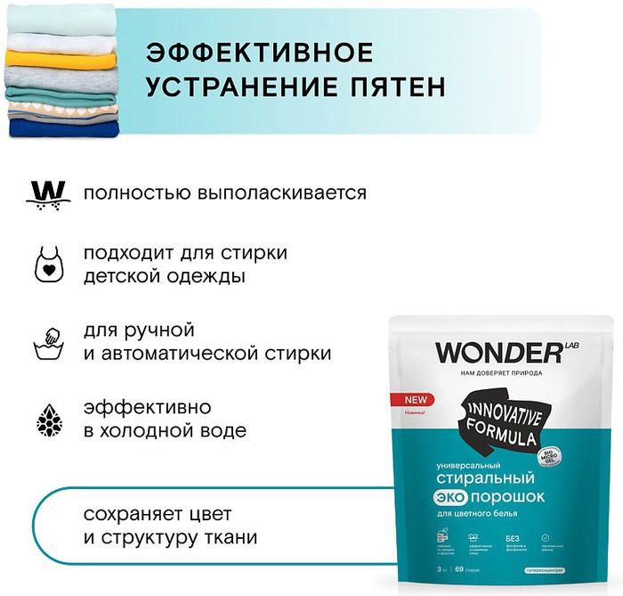 Подходит для стирки детской одежды, сохраняет текстуру и цвет ткани, полностью выполаскивается. Формула экопорошка эффективно устранять пятна от грязи и пыли, какао, ягод, травы, вина и других сложных загрязнений.