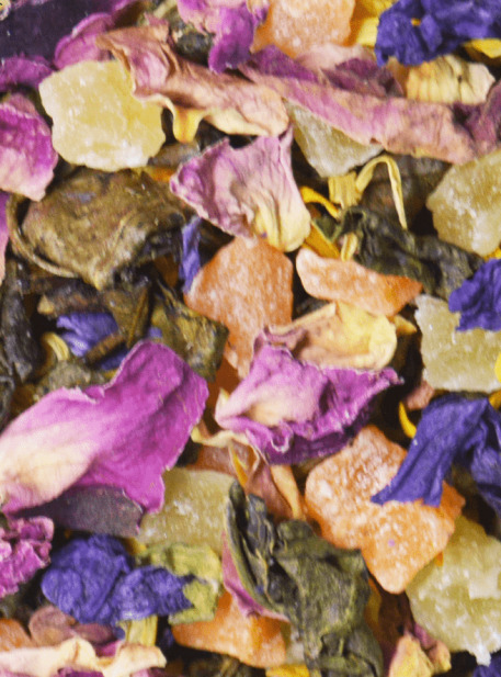 Китайский зеленый чай.  Чай композиционный с ароматом экзотических фруктовСостав: купаж на основе классического зеленого чая Ганпаудер слабой скрутки, лепестков роз, календулы, мальвы, цукатов. Содержит пищевые ароматические масла.Это потрясающий чай, равного которому по богатству и качеству состава среди ароматизированного чая почти не встретишь. Тонкий, притягательный, он заставляет обратить внимание на красоту самого чая, яркие, разноцветные лепестки, на фоне нежной зелени чайного листа. . На чайник 450 мл нужно 1-2 ч. ложки заварки. Подходит вода, разогретая до 80 градусов.