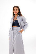 Жакет прямого силуэта, умеренного объёма, длиной до бёдер. Жакет с подкройными бочками по косой, воротник отложной пиджачного типа.