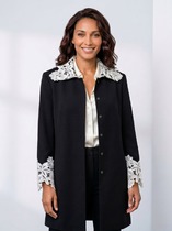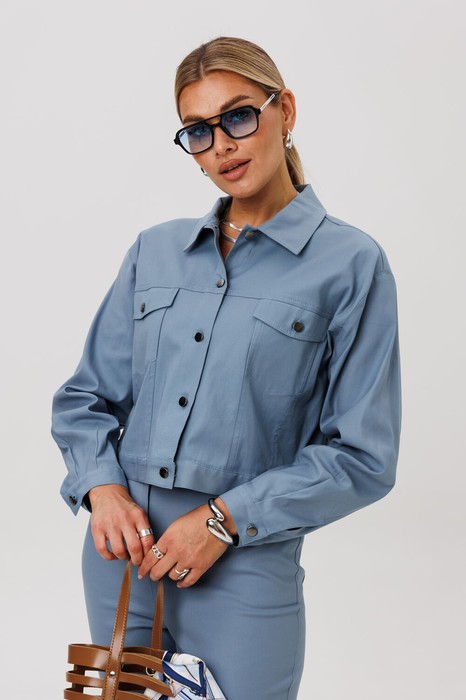Жакет укороченный, прямого кроя. Переднюю часть украшают нагрудные карманы с декоративными клапанами. Застёжка на петли и кнопки добавляет модели характер, а спинку завершает изящная кокетка. Длинные рукава заканчиваются манжетами, а горловина обработана аккуратным воротником.