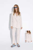 Жакет полуприлегающего силуэта выполнен из полотна насыщенного голубого цвета. Характеристики: полуприлегающий силуэт, подкладка, подплечники, двубортная застежка, миниатюрные не функциональные пуговички по переду изделия, воротник с остроугольным лацканом, по переду карманы с клапаном, рукав втачной, по низу рукава вертикальный разрез, разрез на пуговичках. Длина жакета 69 см, длина рукава 63.