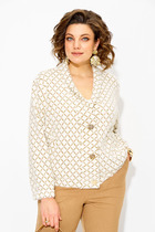 Жакет прямого свободного кроя выполнен из костюмной ткани с геометрическим принтом. Характеристики: прямой крой, однобортный, подкладка, подплечники, отложной воротник с остроугольным лацканом, застежка центральная на петли пуговицы, по переду функциональные карманы с клапаном, рукав втачной, по низу рукава нашиты пуговички, в среднем шве заднего полотна изделия разрез 24 см. Длина по спинке 77 см, длина рукава 62 см.