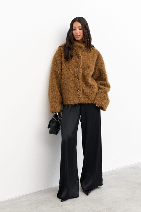 Укороченный жакет прямого кроя, выполнен из теплой ворсистой ткани, цвета Хаки. Характеристики: прямой крой, подкладка, застежка центральная на петли пуговицы, рукав свободного кроя спущен. Длина по спинке 68 см, длина рукава от края горловины 70см.