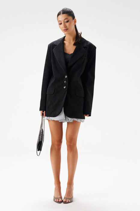 Жакет однобортный. Выполнен из эко-замши. Прямой крой, горизонтальный подрез ниже линии талии, подклад, разреза в спинке нет. Воротник с остроугольным лацканом. Застёжка контрастные петли-пуговицы. Карманы по переду внизу с клапаном без застёжки (функциональные), по груди карман-листочка (нефункциональный). Рукав втачной, на рукваве контрастные петли-пуговицы (нефункциональные), длина 65 см. Длина спинки 77 см