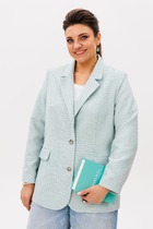 Жакет прямого свободного кроя, выполнен из ворсистой ткани серого цвета. Характеристики: горловина стойка, застежка центральнаяна петли пуговицы,рукав прямой, по плечевому шву пата на пуговице, на левом рукаве нашивка Annete. Длина по спинке 46 см, длина рукава 62 см.