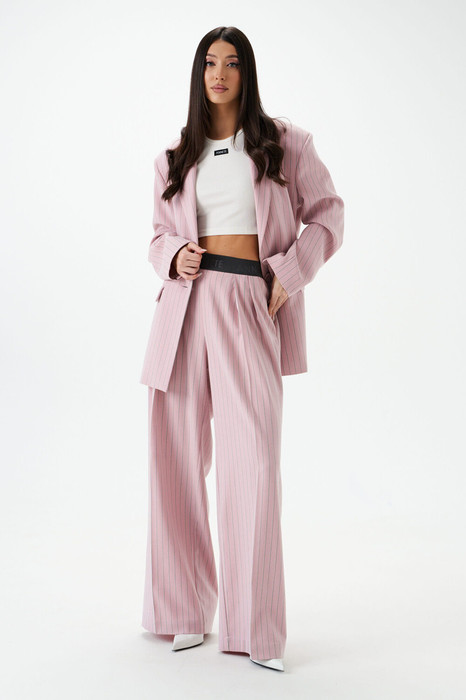 Жакет прямого свободного кроя выполнен из костюмной ткани нежно-розового цвета с принтом вертикальная полоска.Характеристики: прямой свободный крой, подкладка, подплечники, воротник с остроугольным лацканом, застежка центральная на петли - пуговицы, по переду функциональные карманы с клапаном, рукав втачной, по низу рукава нашиты пуговички, спинка со средним швом, в среднем шве разрез 27 см. Длина по спинке 76, длина рукава 63 см.