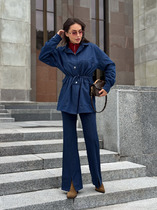 Жакет прямого свободного кроя. Выполнен из костюмной ткани синего цвета с полоской голубого цвета. С подкладкой. Воротник отложной, с лацканами. Рукав втачной, немного спущен. Есть подплечники. По переду карманы с клапаном (функциональные). В среднем шве заднего полотна высокая шлица (48 см). Застёжка центральная пуговицы. Длина спинки 76 см. Длина рукава от линии втачиваня 61 см. В комплекте пояс из основной ткани