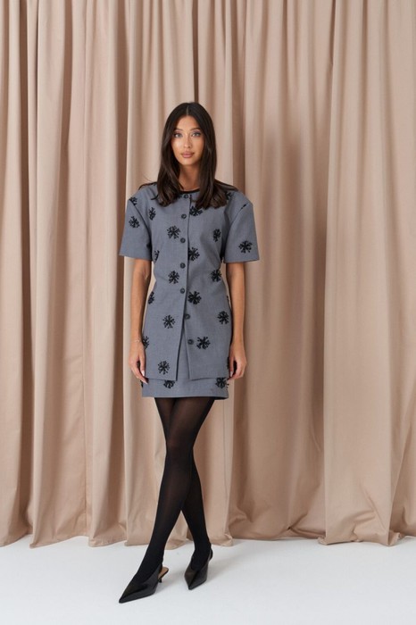 Жакет прилегающего силуэта. Выполнен из костюмной ткани с фактурной вышивкой. С подкладкой. Круглый вырез горловины. Рукав втачной, короткий. Спинка с поясом, выходящим из боковых швов. Застёжка центральная - пуговицы. Длина спинки 72 см. Длина рукава от линии втачивания 22 смЖакет дополнит юбка А1621
