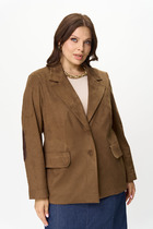 Жакет двубортный, полуприталленого силуэта. Выполнен из костюмной ткани чёрного цвета. Характеристика: отложной воротник с остроугольными геометрическими лацканами, вточной рукав, подклад, подплечники, талиевые выточки по переду, отрезная боковая планка, по переду изделия карманы-листочки, талиевые вытачки по спинке, брендированная подкладка. Длина рукава 24 см. Длина спинки от края горловины 72 см.